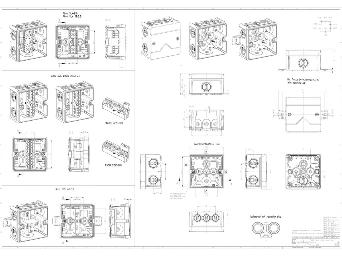 AP-Abzweigdose Demelectric Spelsberg Abox 025 AB-L/sw, Länge 87 mm, Breite 87 mm, Tiefe 52 mm, Schutzart IP66, Farbe schwarz, zertifiziert durch VDE DIN EN 60670-1/-22 (VDE 0606-1/-22), DLG (Ammoniakbeständigkeit), Einführungsmembranen M16/M20 (1 rückseitig und 8 seitlich), Dichtbereich 4…16 mm, selbstdichtend, aussenliegende Befestigungsstellen