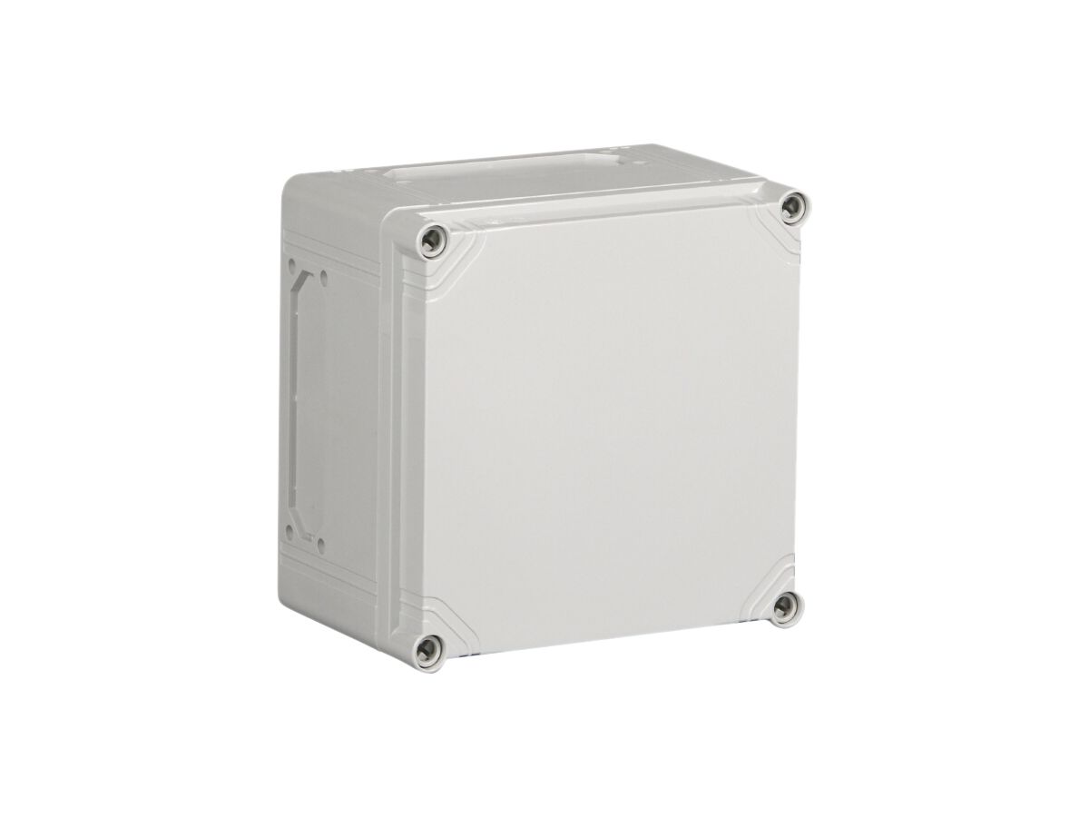 Apparategehäuse Swibox CUBO C, leer, Innen- und Aussenmontage CPCF, glasfaserverstärkt, schlagfest, flammwidrig, T -50…130 °C, UV-beständig, Buchsen für Montageplatte, Lochplatte oder Profilschiene EN 50022-35, inkl. 4 Befestigungsschrauben, Flanschöffnungen allseitig ausbrechbar, Deckel grau, plombierbar