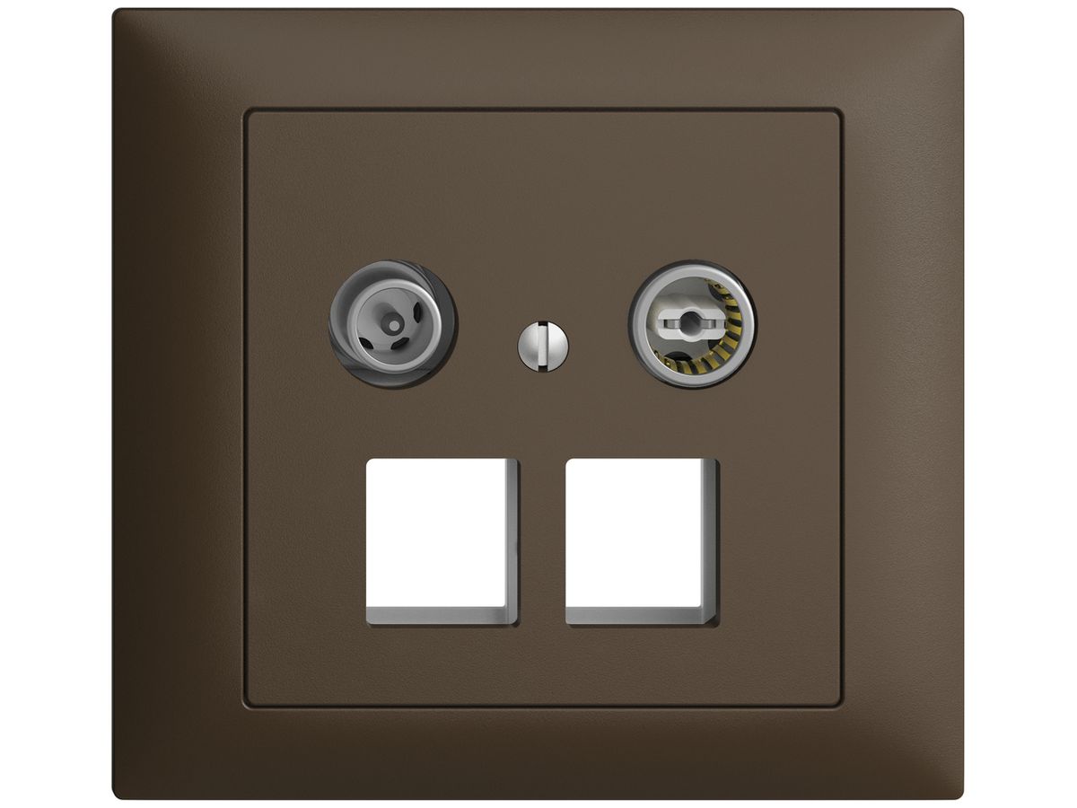 EB-Multimediadose Feller EDIZIOdue FKE, Enddose / Durchgangsdose, mit Abschlusswiederstand, Schirmungsmass der Klasse A (+10 dB), für 2×RJ45-Anschlussmodule Keystone, mit Abdeckrahmen 80×86 mm, Einbautiefe 33 mm, coffee