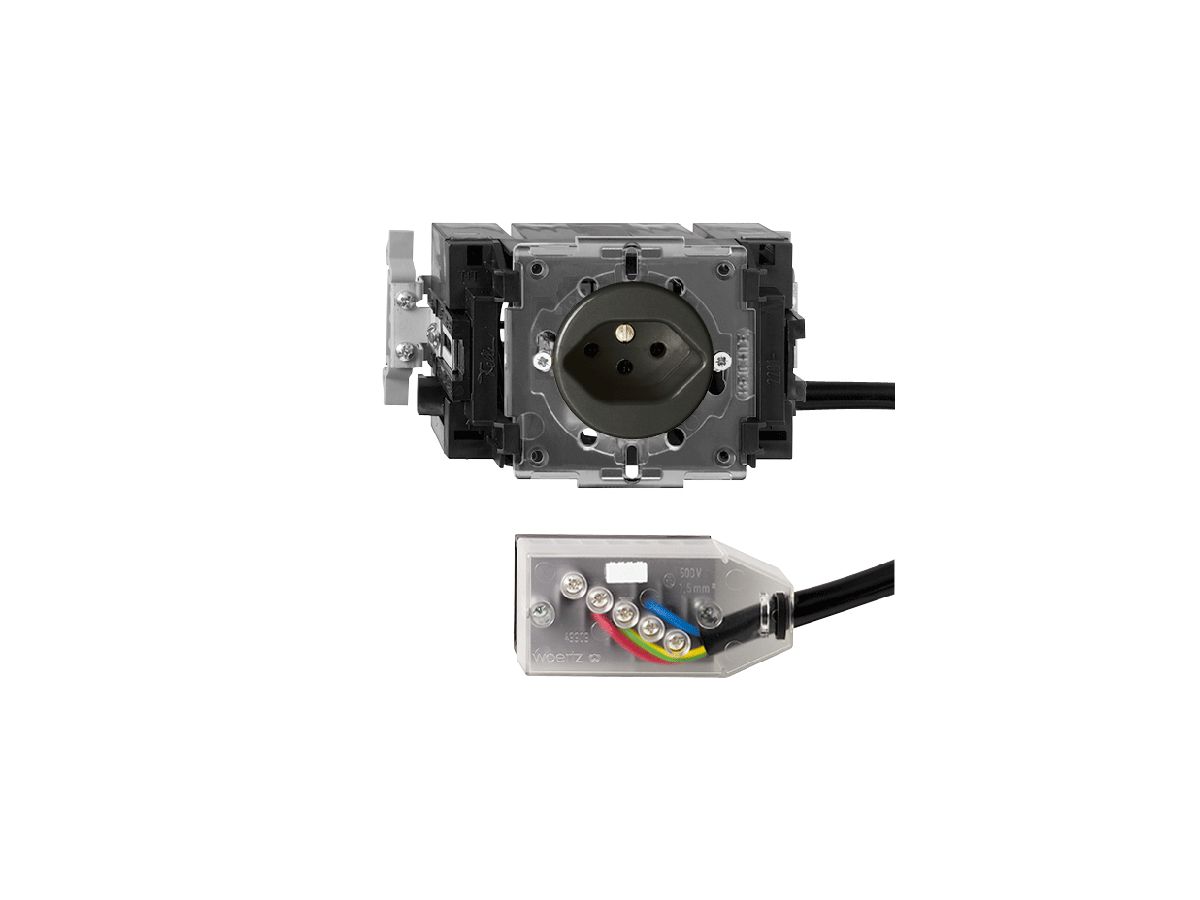 Steckdose Typ 13 Feller Standard JK.53, mit Flachkabel-Anschluss Technofil, Einbautiefe verstellbar 49…69 mm (eingestellt auf 53 mm), Abzweigdose Technofil, 10 A, Anschlusskabel Td 3×1.5 mm² schwarz, Länge 300 mm, Frontscheibe für Bohrung Ø 43/47 mm