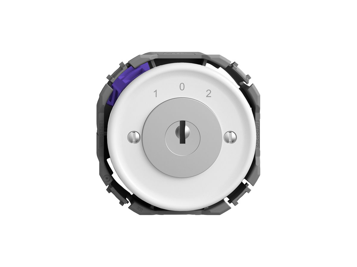 Schlüsselschalter AWAG CA10.A228.Q.A.SS.61, Design Feller STANDARDdue, mit Schalterzylinder KABA 1007F, Schliessung 5000 und 2 Schlüsseln mit Rückzug nach 0, Wendeumschalter, 3-polig, Funktion 1-0-2, Beschriftung 1-0-2, Schaltwinkel 30°, 3 Fluchten, Frontscheibe 60 mm für Bohrung 58 mm, LED-Last max: 200 W, kompatibel mit Feller SNAPFIX®
