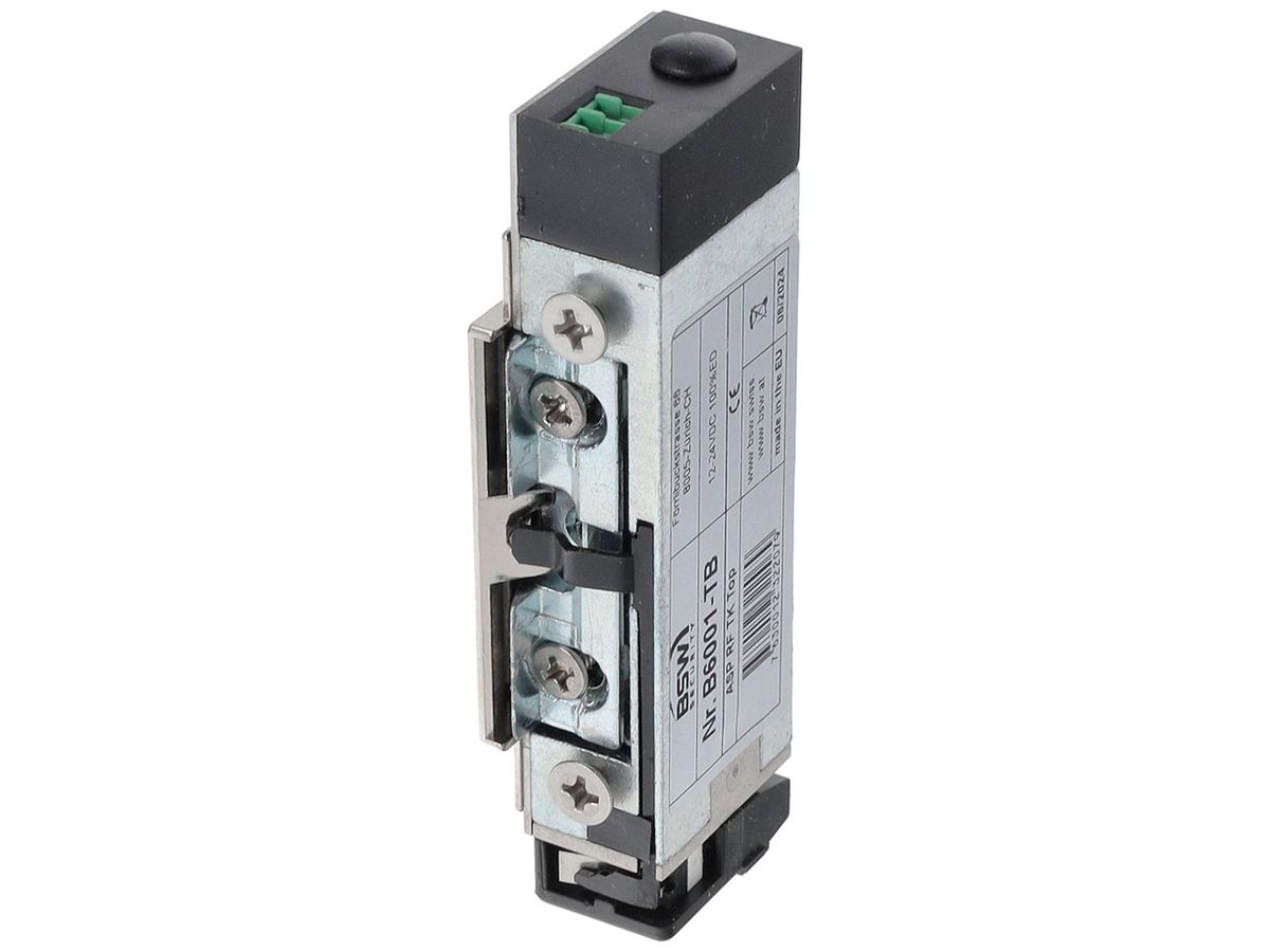 Türöffner BSW B6001-TB, Ausführung Standardtüröffner, Art der Entriegelung verstärkte Ausführung, Ausführung der Falle Radiusfalle, Bauform asymmetrisch, Einbaulage vertikal, Zusammenstellung Rahmenteil, Montageart Einbau, Öffnungsrichtung nach DIN links/rechts, mit Rückmeldung, verstellbare Türöffnerfalle, Fallenführung integriert, Breite 19.55 mm, Höhe 81.25 mm, Tiefe 26 mm, Spannung 12…24 V, Arbeitsweise Arbeitsstrom, Stromart DC, Stulpform eckig, max. Fallenvorlast 200 N, bipolare Schutzdiode