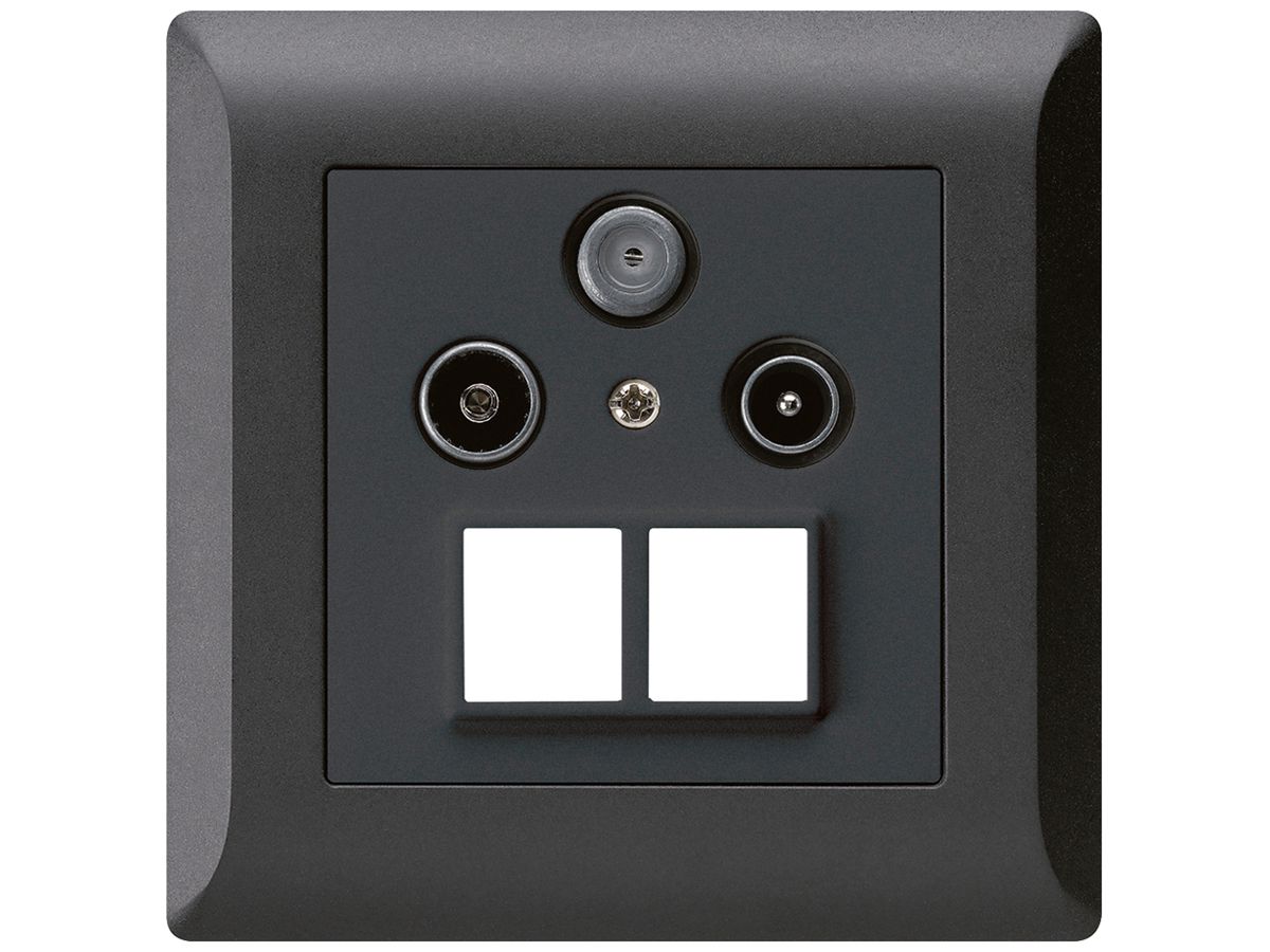 UP-Antennendose Hager HMS kallysto.line, R/TV/SAT, 2×IEC, 1×F, mit Aussschnitt für 2×RJ45, Abdeckrahmen 92×92 mm, Frontplatte 60×60 mm, Duroplast, schwarz