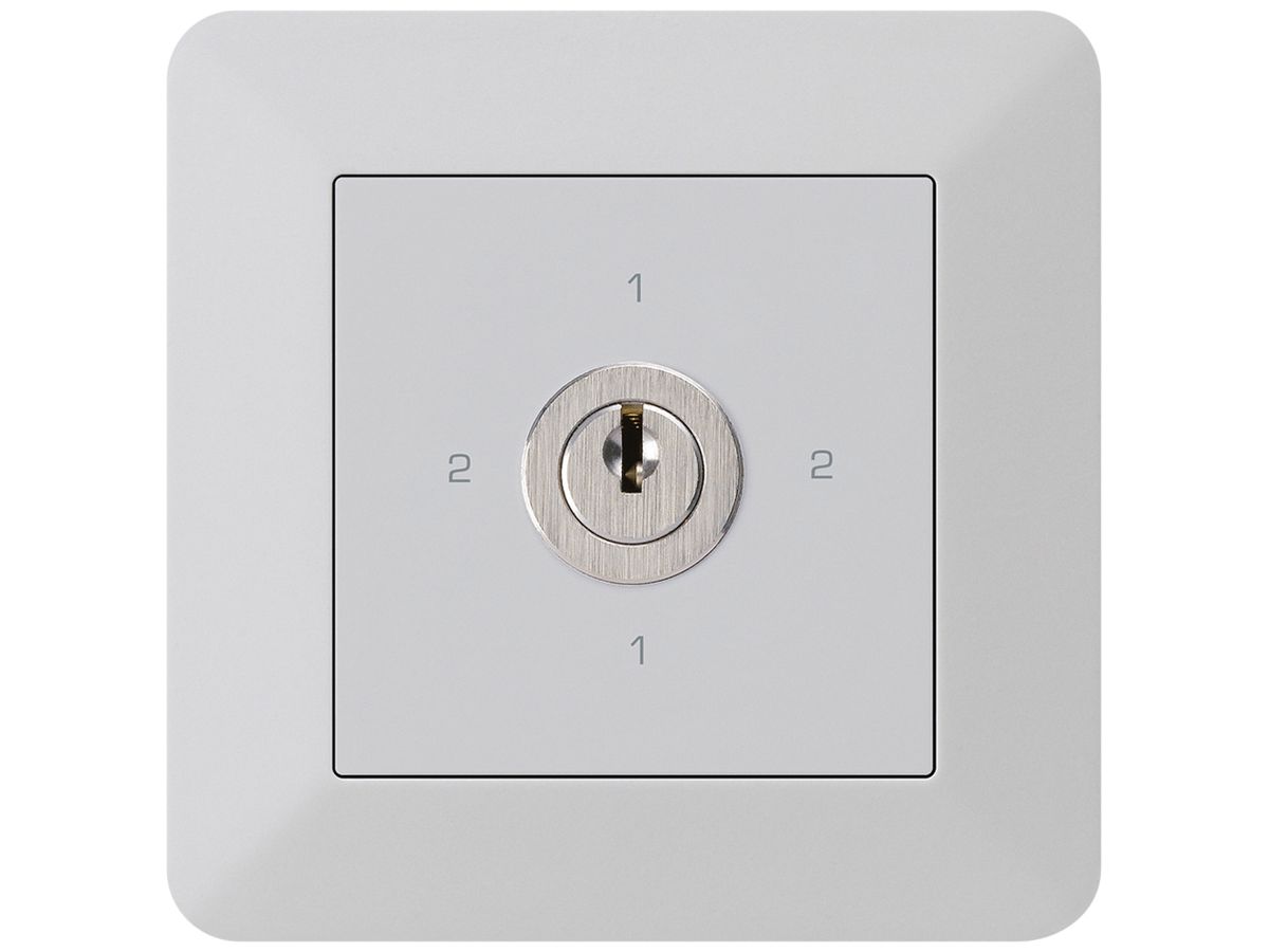 UP-Schlüsselschalter Hager kallysto.trend, Abdeckrahmen, Frontplatte 60×60 mm, Duroplast weiss, Befestigungsplatte 77×77 mm, Einsatz Kraus & Naimer Blue Line, Schaltwinkel 90°, mit Sicherheitsschloss, 2 Schlüssel
