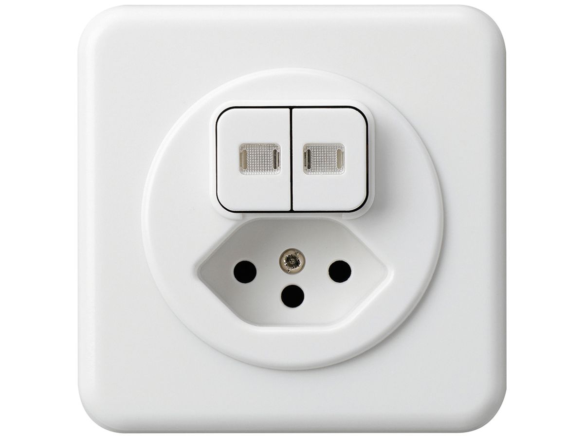 UP-Kombination Leucht-Drucktaster + Steckdose Typ 13 Hager basico, mit Frontscheibe, ohne Kinderschutz, Steckklemmen