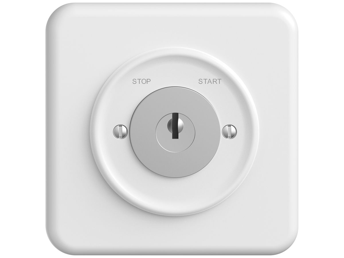 UP-Schlüsselschalter AWAG CA10.A176.QMI.A.SS.61, Design Feller STANDARDdue, mit Schalterzylinder KABA 1007F, Schliessung 5000 und 2 Schlüsseln, Ein-Aus-Taster, Steuerschalter, 1-polig, Funktion STOP > < START, Beschriftung STOP-START, Schaltwinkel 30°, 1 Flucht, LED-Last max: 200 W, kompatibel mit Feller SNAPFIX®