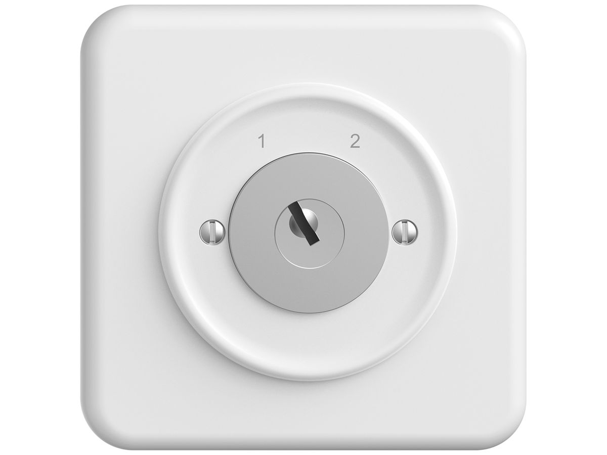 UP-Schlüsselschalter AWAG CA10.A721.QMI.A.SS.61, Design Feller STANDARDdue, mit Schalterzylinder KABA 1262KA, Schliessung 5000 und 2 Schlüsseln, mit galvanisch getrennten Kontakten, Umschalter, ohne 0-Stellung, 2-polig, Funktion 1-2, Beschriftung 1-2, Schaltwinkel 60°, 2 Fluchten, kompatibel mit Feller SNAPFIX®