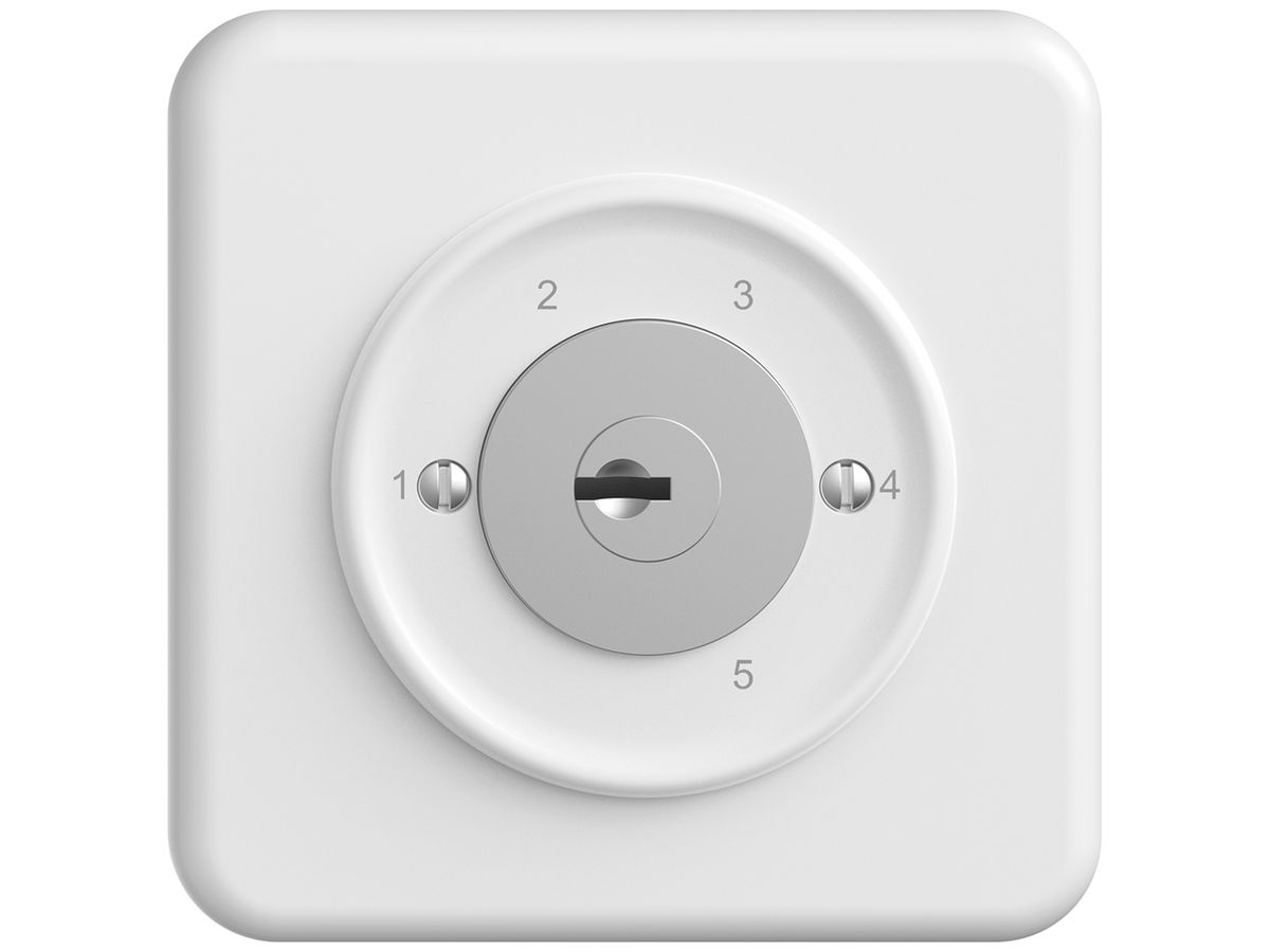 UP-Schlüsselschalter AWAG CA10.A232.QMI.A.SS.61, Design Feller STANDARDdue, mit Schalterzylinder KABA 1262KA, Schliessung 631984 und 2 Schlüsseln, Stufenschalter, 5 Stufen, ohne 0-Stellung, 1-polig, Beschriftung 1-2-3-4-5, Schaltwinkel 60°, 3 Fluchten, LED-Last max: 200 W, kompatibel mit Feller SNAPFIX®