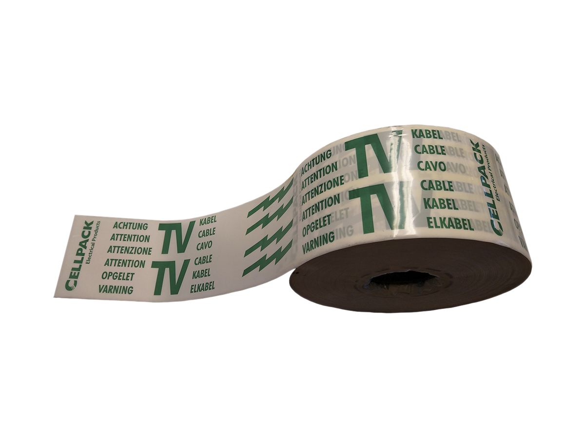 Warnband Cellpack, Polyethylen, Grund weiss, zum Schutz von Rohren und Kabeln im Erdreich, vor Beschädigungen durch Baumaschinen, Länge 250 m, Dicke 0.2 mm, Dehnung ≤ 400 %, Rolle, Achtung TV-Kabel
