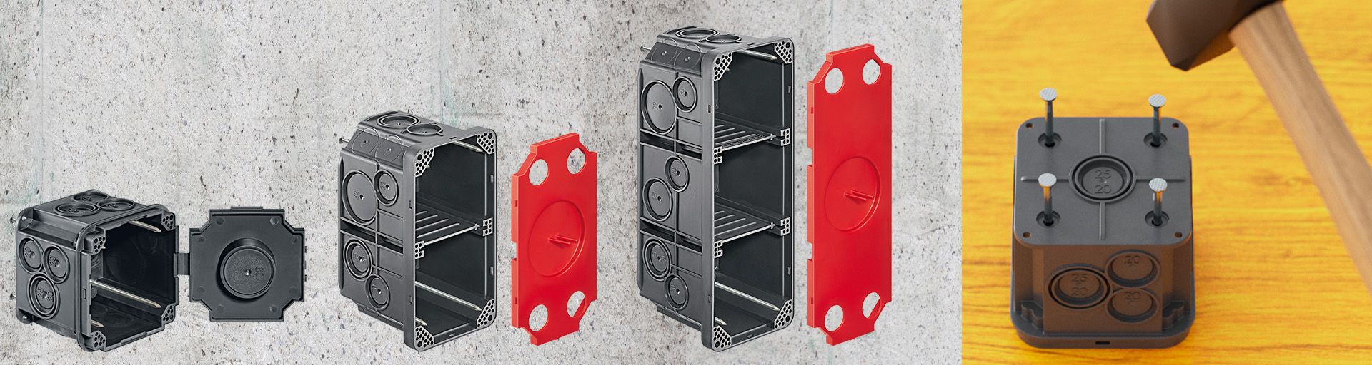 Mit ihrer Spezialtiefe von 70 mm, den stabilen Zwischenwänden und dem steckbaren Mittelsteg erfüllen die Vario-Dosen höchste Ansprüche auf der Baustelle. Der mitgelieferte Deckel sorgt für Formstabilität beim Betonieren.
