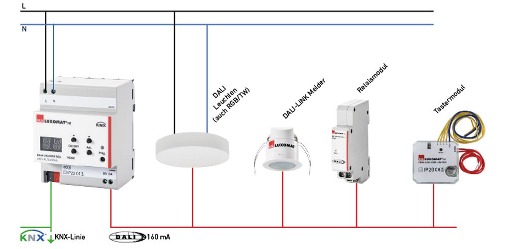Das System lässt sich intuitiv in bestehende und neue Gebäudeinstallationen integrieren und verbindet alle Teilnehmer direkt über den DALI-Bus, ohne zusätzlichen Installationsaufwand.