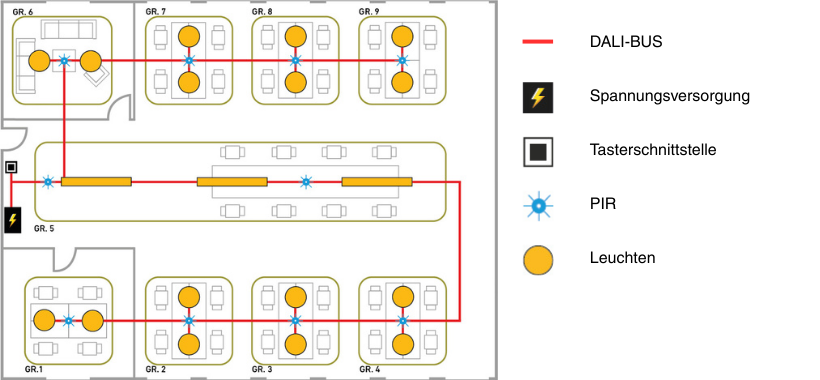 Die nachfolgende Grafik veranschaulicht den Aufbau eines DALI-LINK-Lichtsteuerungssystems in einem Bürogebäude. Die rote Linie stellt den DALI-Bus dar, über den sowohl die Spannungsversorgung als auch die Steuerbefehle übertragen werden.