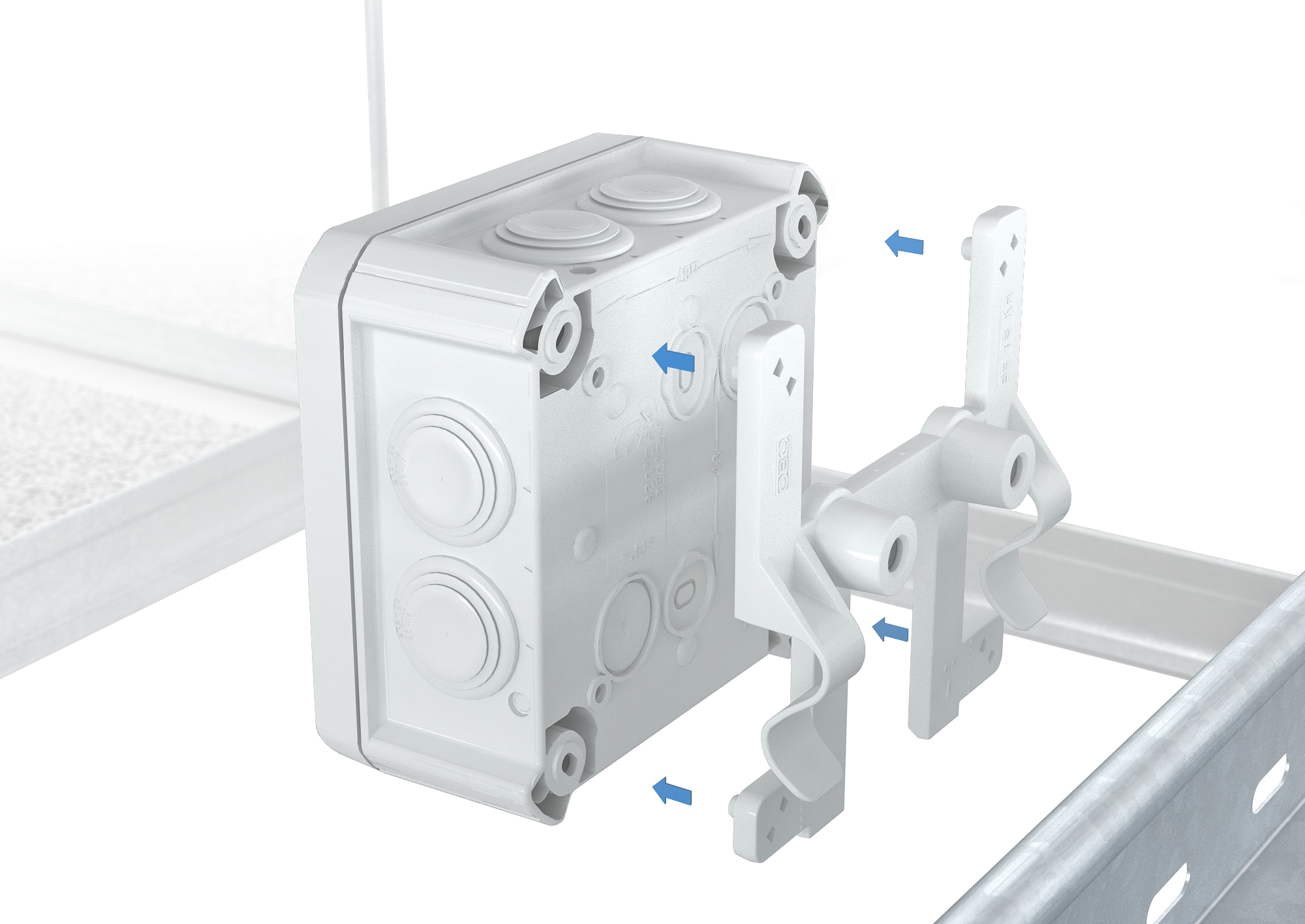 Dank werkzeugloser Montage mit den Befestigungselementen BE TS sitzen die T60 und T100 Dosen im Handumdrehen perfekt auf jeder Kabel- oder Gitterrinne.