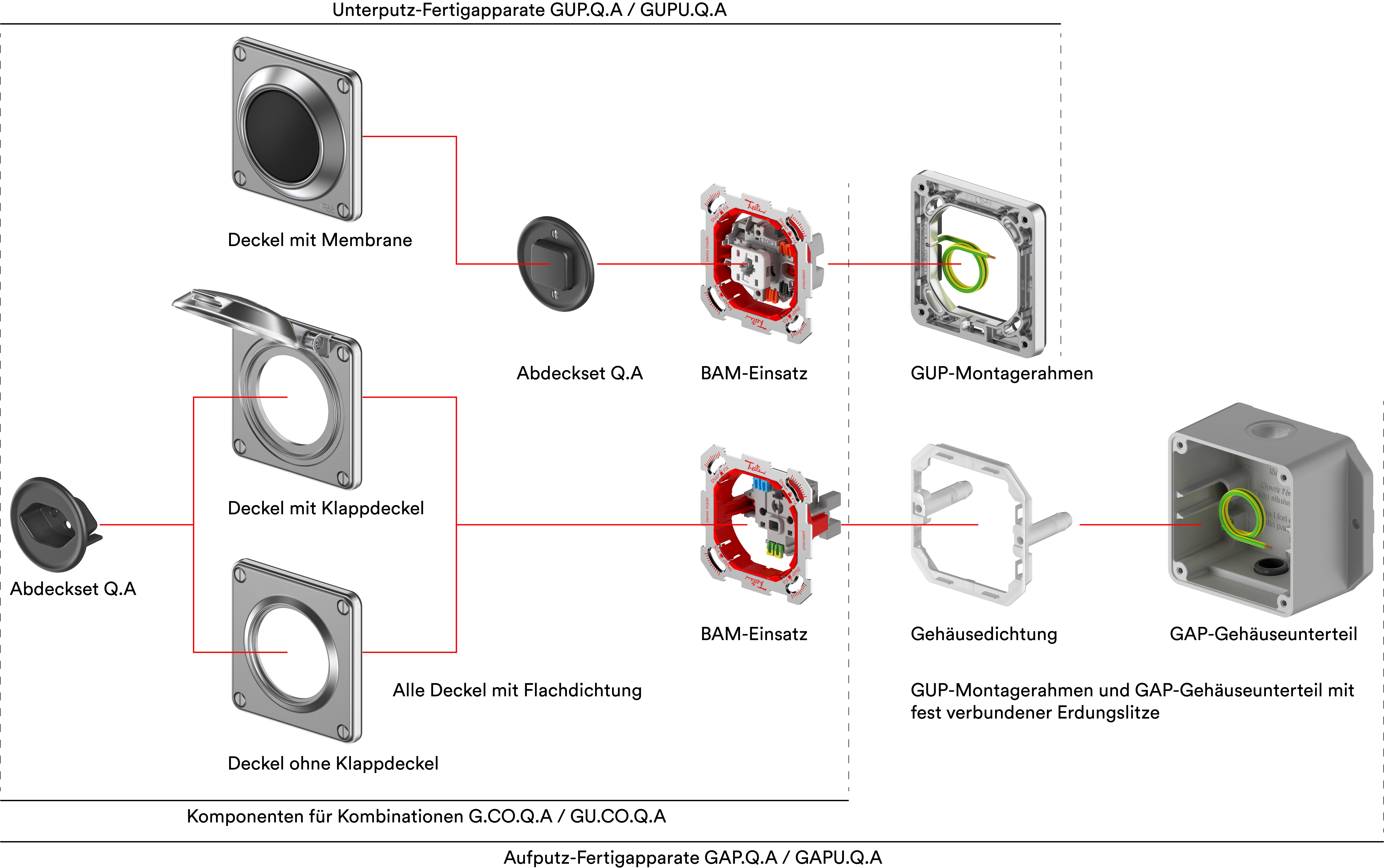 - Vereinheitlichte Abmessungen mit Achsabstand 100 mm bei AP wie auch bei UP